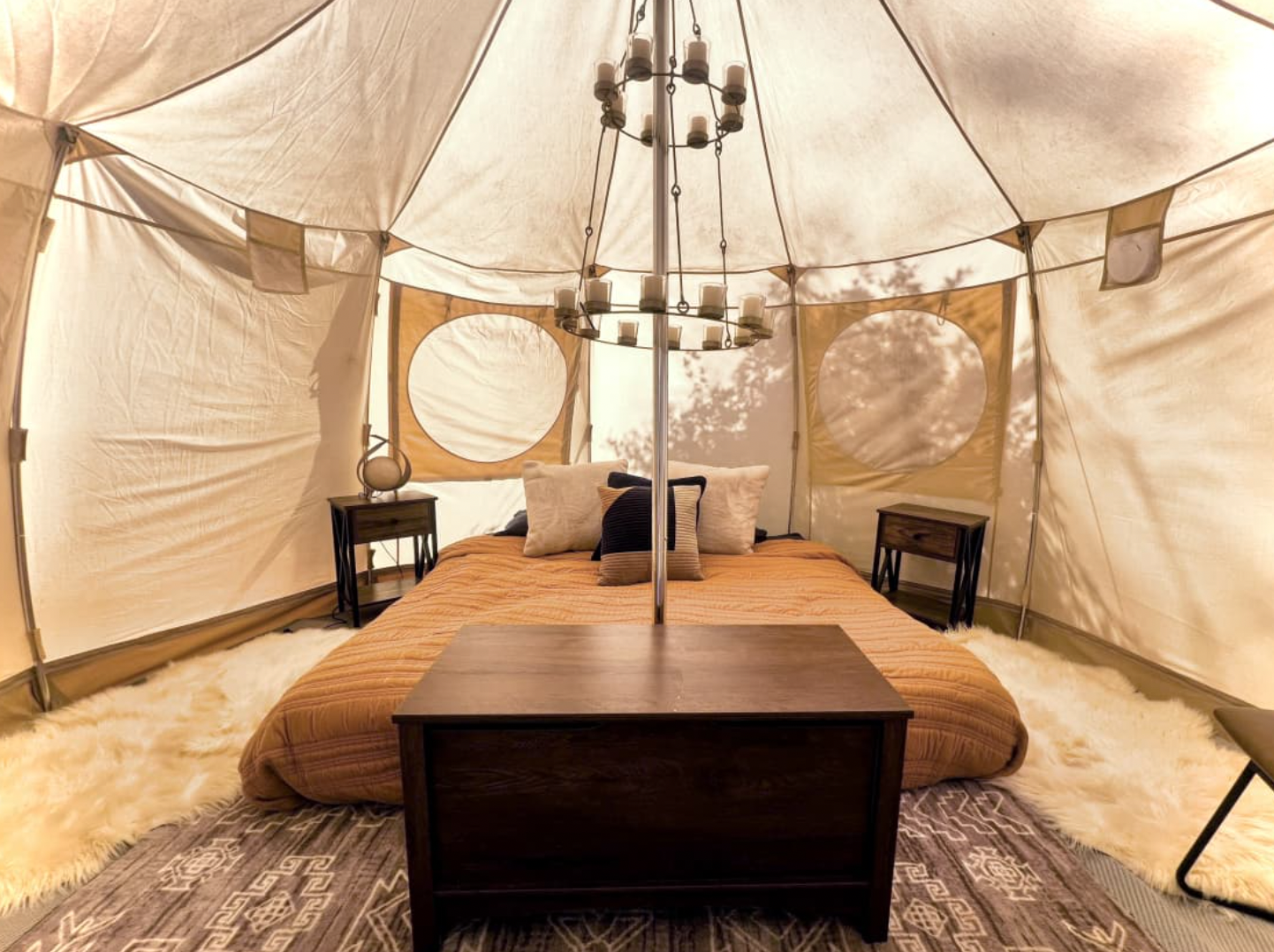Soak in a cedar hot tub and Renu cold plunge nestled in an oak grove, then sleep in one of our two luxurious yurt-like tents. Venture into the clearing with open skies for truly amazing starry views at night. It's a peaceful retreat surrounded by pines and oaks, yet is still less than 15 minutes from the historic Gold Mining towns of Nevada City and Grass Valley. A composting toilet is housed in a beautiful, well maintained outhouse and a heated outdoor shower is located next to the hot tub and cold plunge. These as well as the hot tub/cold plunge area are shared between our two sites.